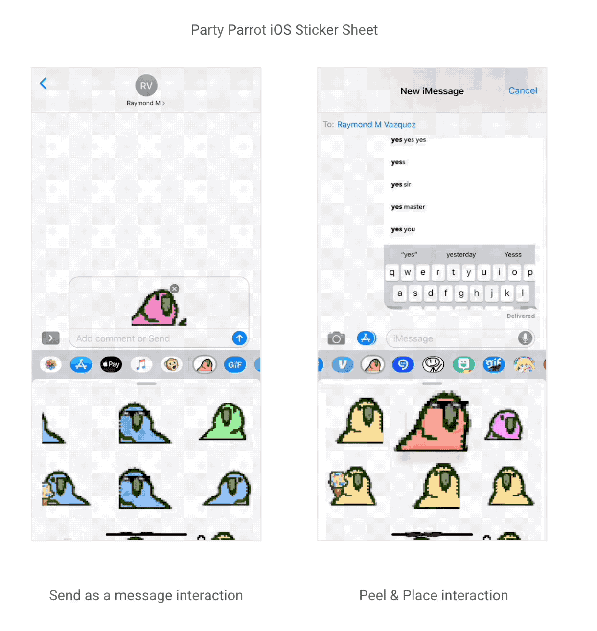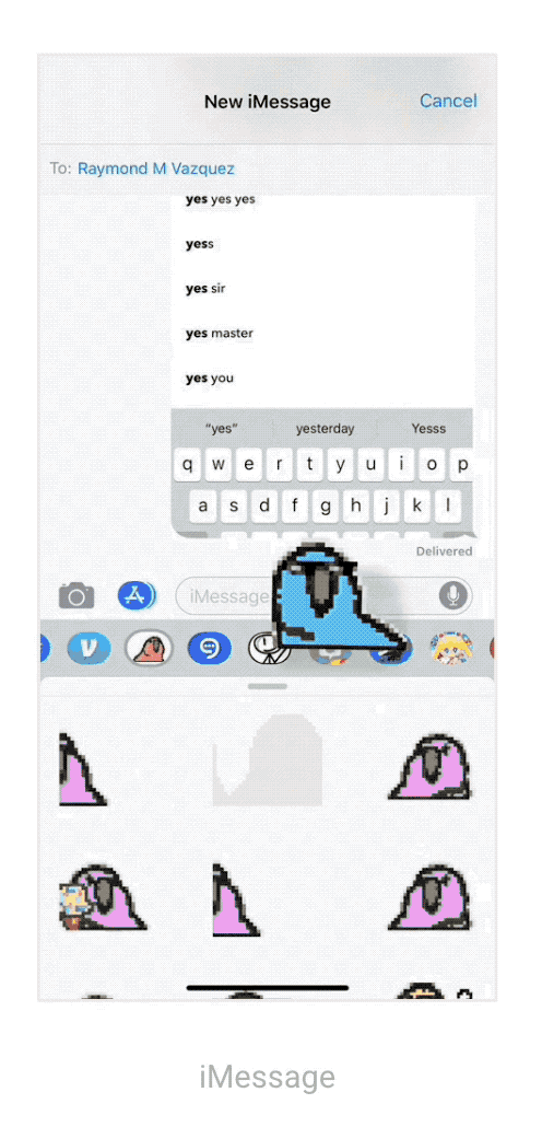 If a user taps on a Sticker, it will be inserted into the iMessage input box, ready to be sent much like how GIFs are sent. However, with Stickers users can also hold down on the stickers, which will invoke a βpeelingβ and βplacingβ interaction. The user is then able to drag the Sticker with their finger and insert it into a message.
