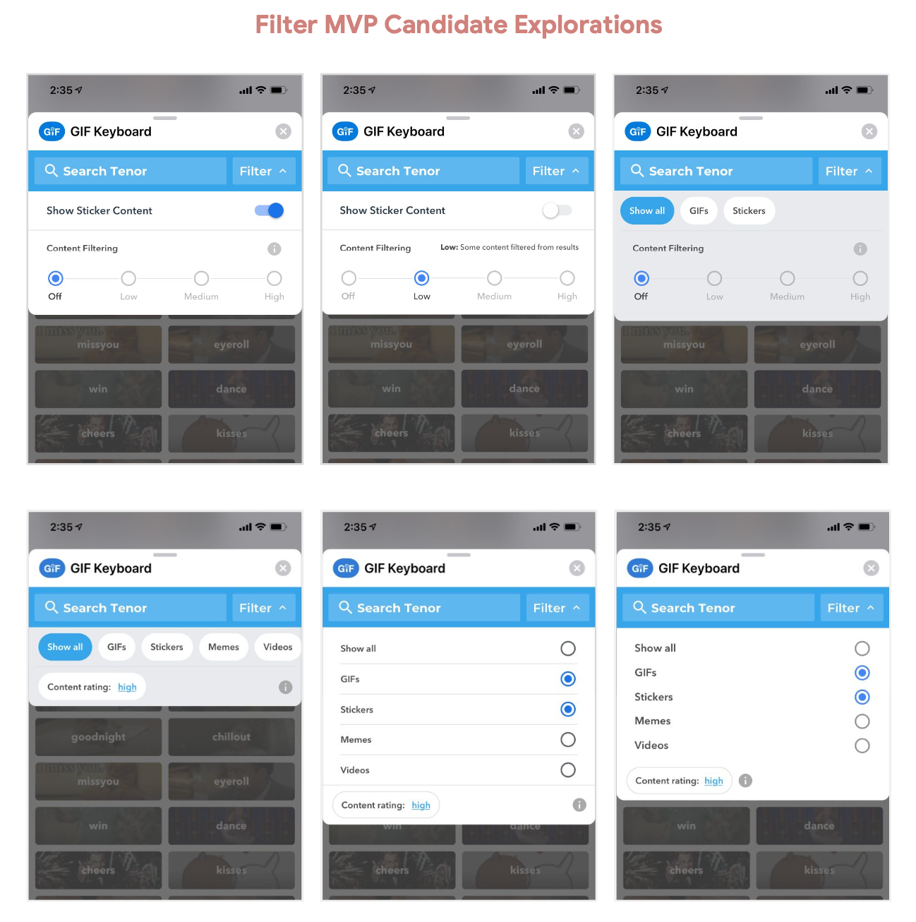 I advocated for a scalable UX approach (the content filter) which will benefit Tenorβs ecosystem long-term. Eng time was longer but through working with stakeholders I was able to convince them this was the best solution for our users.