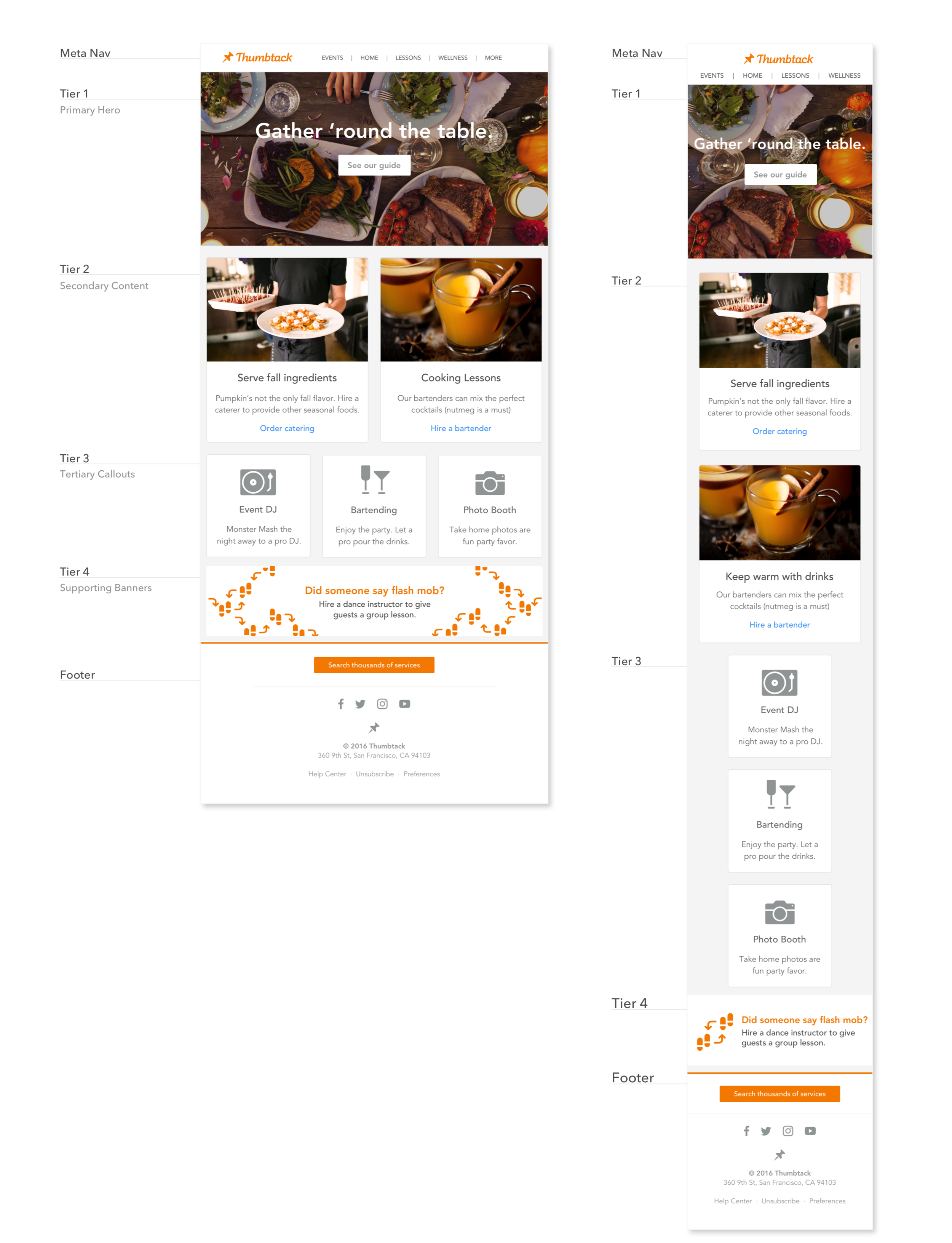 The challenge was to design an email system that makes every customer's impression feel like a part of a cohesive brand story. By building a comprehensive user-friendly modular system, the design was able to support Thumbtack's customer email team in delivering on-brand email campaigns at scale.